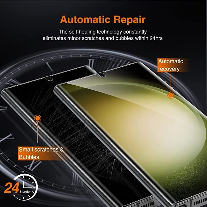 [SJÄLVLÄKANDE OCH INGEN BUBBLA] – flexibel film har självreparerande teknologi, som hjälper till att eliminera mindre repor på filmen helt av sig själv. Små repor och luftbubblor kan repareras automatiskt inom 24 timmar på grund av användningen av ett högpermeabilitetslim med stark vidhäftning. Om det finns bubblor, försök att försiktigt trycka på bubblorna med fingret eller med ”skraplotten”, men skärmytan behöver en tunn tygdyna för att undvika att repa skyddet.