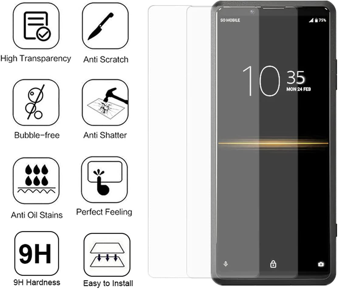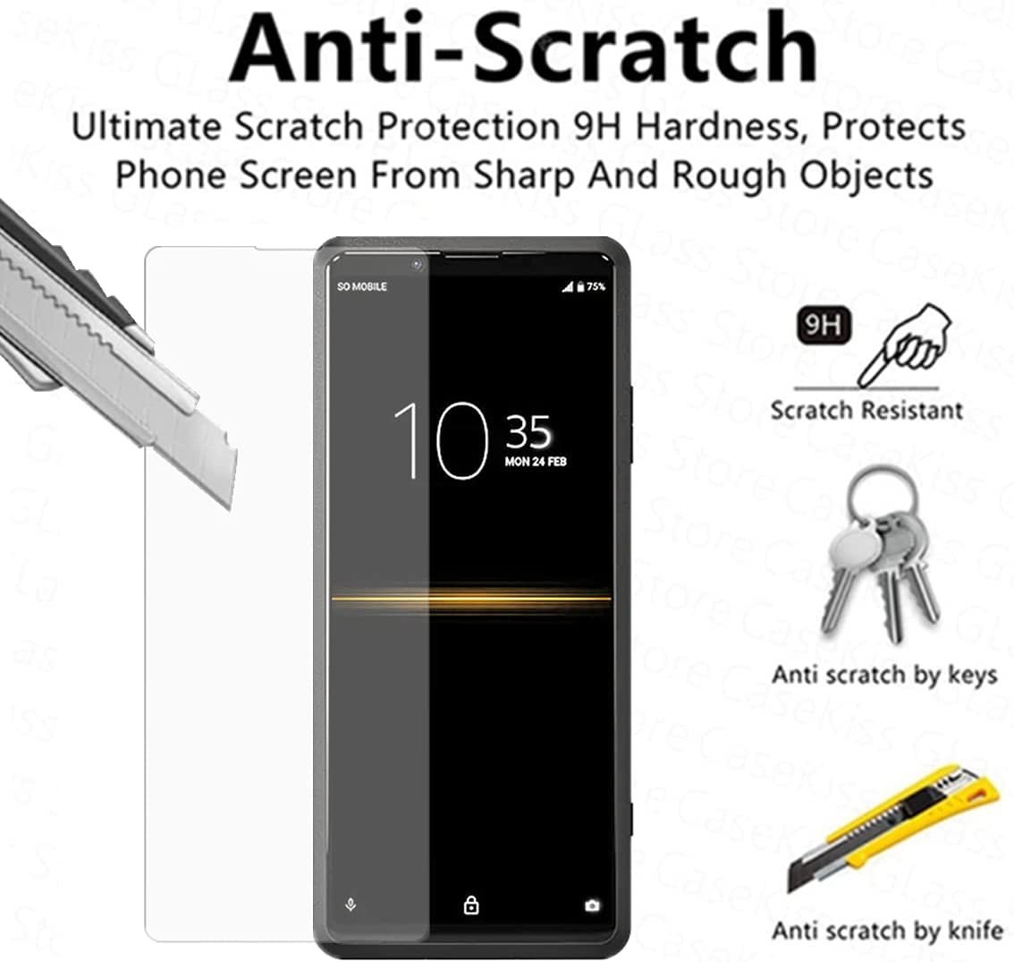 Sony Xperia 5 skärmsydd. Tunt glas ger dig upplevelsen av att känna originalskärmen. 9H stark hårdhet skyddar nycklar och andra yttre föremål. Repad. 2.5D 9H Hårdhet – 2.5D Rounded Edge Glass för komfort på fingret och handen; 9H Hårdhet härdat glas som är reptåligt och spricksäkert som skyddar din skärm från repor till kraftiga fall.