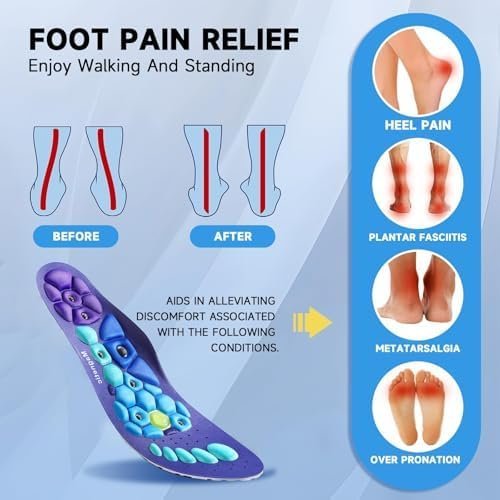 About this item Targeted Acupressure & Magnetic Therapy: Designed with strategic acupressure points and embedded magnets, these insoles stimulate reflexology zones on the feet to relieve pain, reduce inflammation, and improve circulation . Perfect for daily use or post-exercise recovery, they naturally alleviate discomfort in feet, joints, and muscles Ergonomic Arch Support & Shock Absorption: Crafted with high-elastic EVA and suede materials, the insoles provide anatomical arch support to stabilize steps, reduce joint stress, and prevent injuries from prolonged standing or walking. The gel or PVC cushioning layers absorb impact, making them ideal for athletes, workers, or anyone on their feet all day Customizable Fit for All Shoe Types: Available in multiple sizes(US5-13) and cuttable designs, these insoles adapt to sneakers, casual shoes, boots, and even high heels . The slim profile ensures a seamless fit without compromising comfort or style. Health & Wellness Benefits: By stimulating blood flow and metabolic activity, the magnetic therapy helps reduce swelling, detoxify the body, and improve overall wellness . Users report enhanced energy levels, better sleep quality, and even skin benefits due to improved circulation Durable, Breathable, and Easy to Maintain: Made with breathable PVC, EVA, or gel materials, these insoles resist odor and moisture while remaining lightweight for all-day wear . Simply remove and wash to maintain freshness, ensuring long-term hygiene and performance