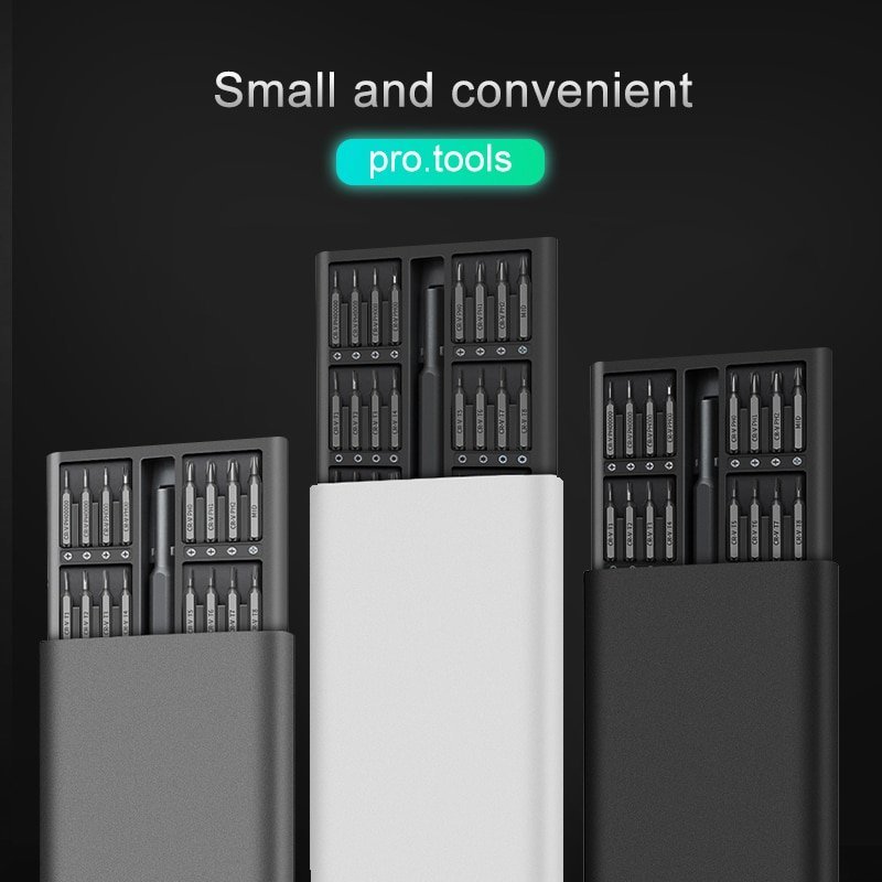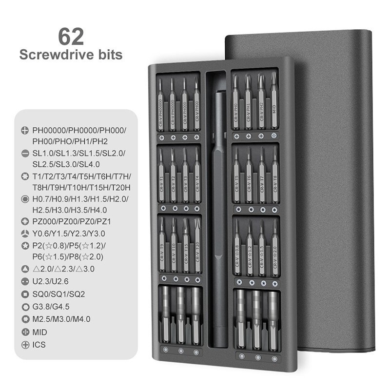 62st skruvbitar och en skruvmejsel, i en förpackningslåda med magnetism. Lätt att använda, hållbar och bärbar.
