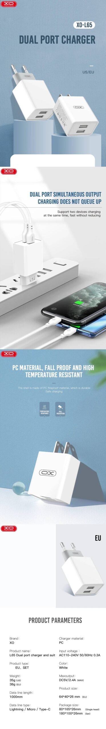 XO L65 är en avancerad laddare med max. 2,4 A ström utrustad med två USB-uttag. Den ger tillräckligt med energi för att ladda även de största tillgängliga mobila enheterna, och en extra Lightning-kabel gör att du kan använda den direkt efter köpet. Det klassiska utseendet passar alla typer av interiörer och kvaliteten på utförande indikerar att det är en solid och hållbar enhet.